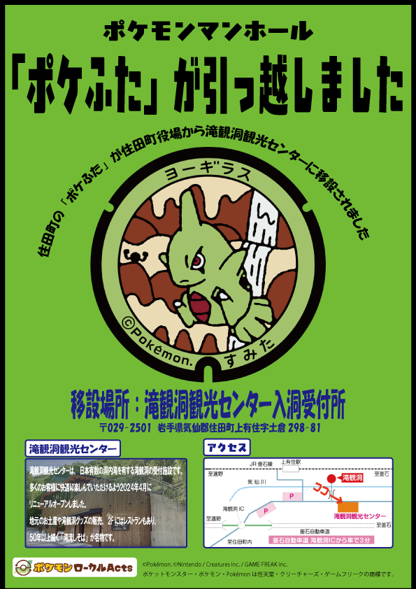 The Pokémon manhole cover, "Pokéfuta," has been relocated to Takikando Cave.